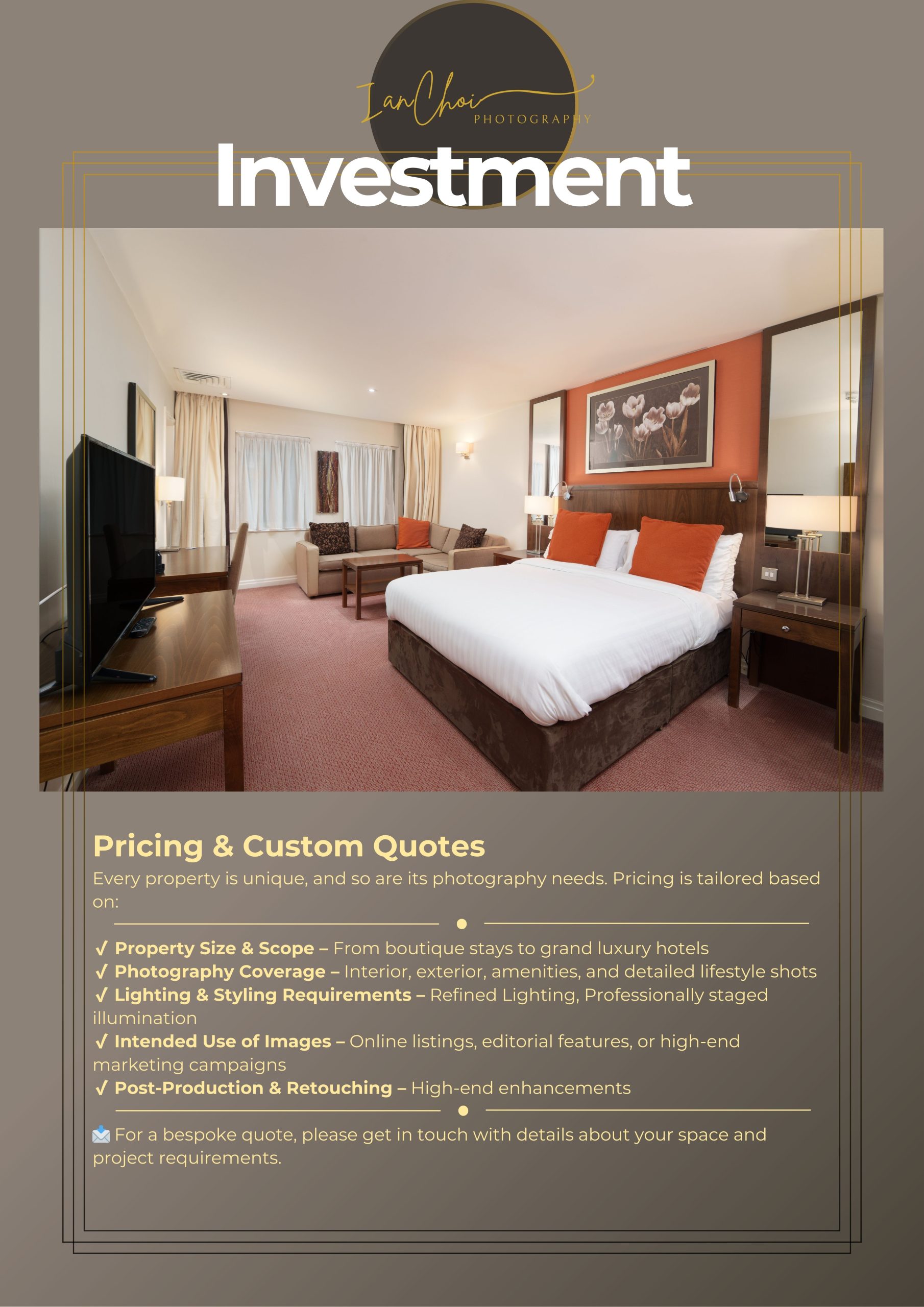 Whether you're looking to capture a hotel, Airbnb, interior space, product or culinary brand, my aim is to make the entire process feel thoughtful, professional and tailored to your goals.